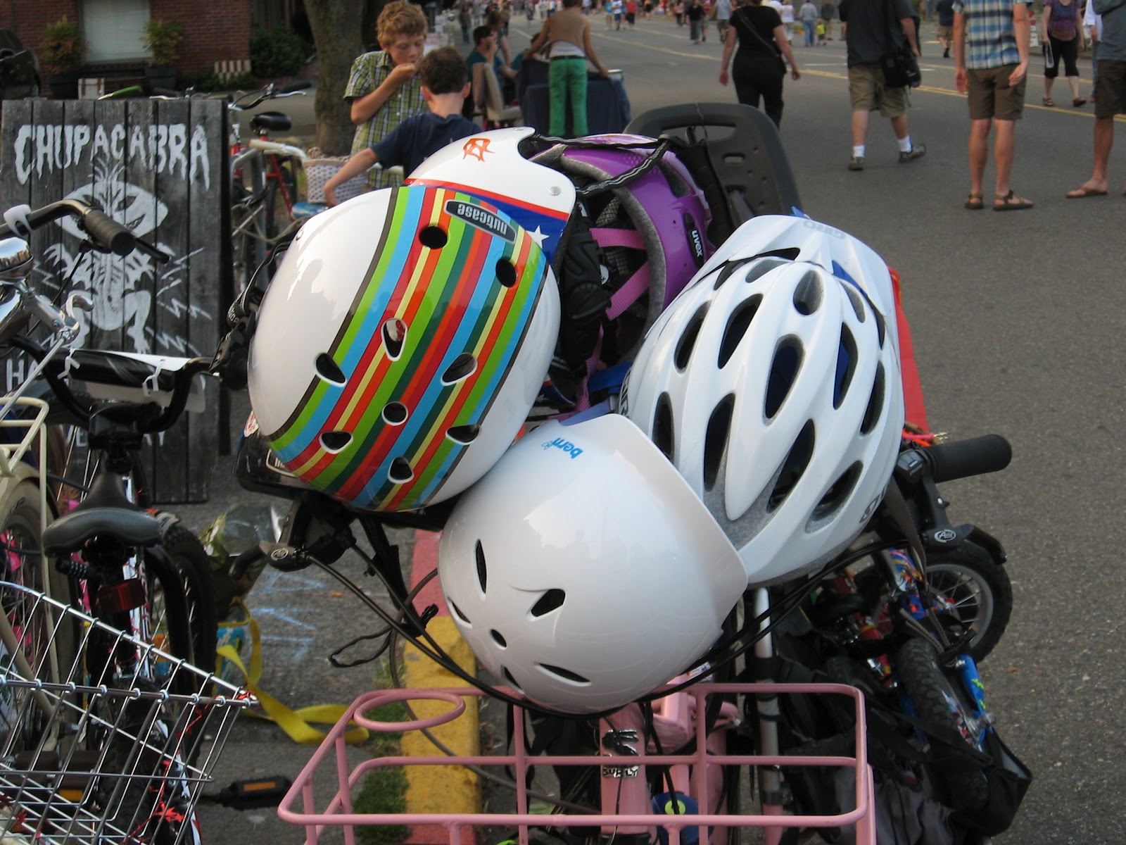 After a lot of street partying, we were all getting hungry. There really weren't any street vendors, so we locked our bikes and helmets into an impressive pile and tried to get a table at a nearby restaurant. Alas the wait was long and our party was large, containing many children, so it was not to be. We had to say our goodbyes and get home before dark. It was so much fun to be out and having fun in the street and meeting friends, new and old!