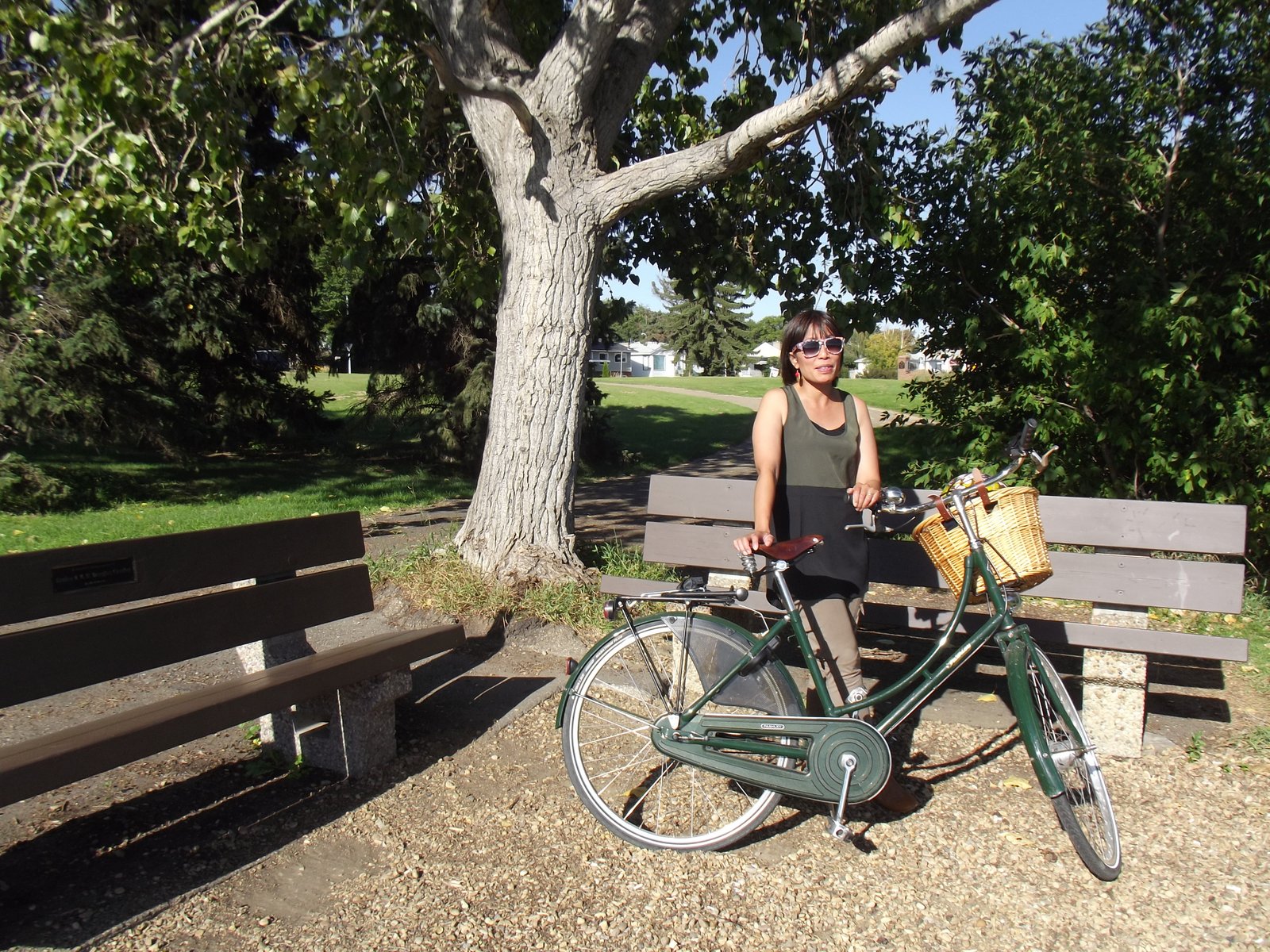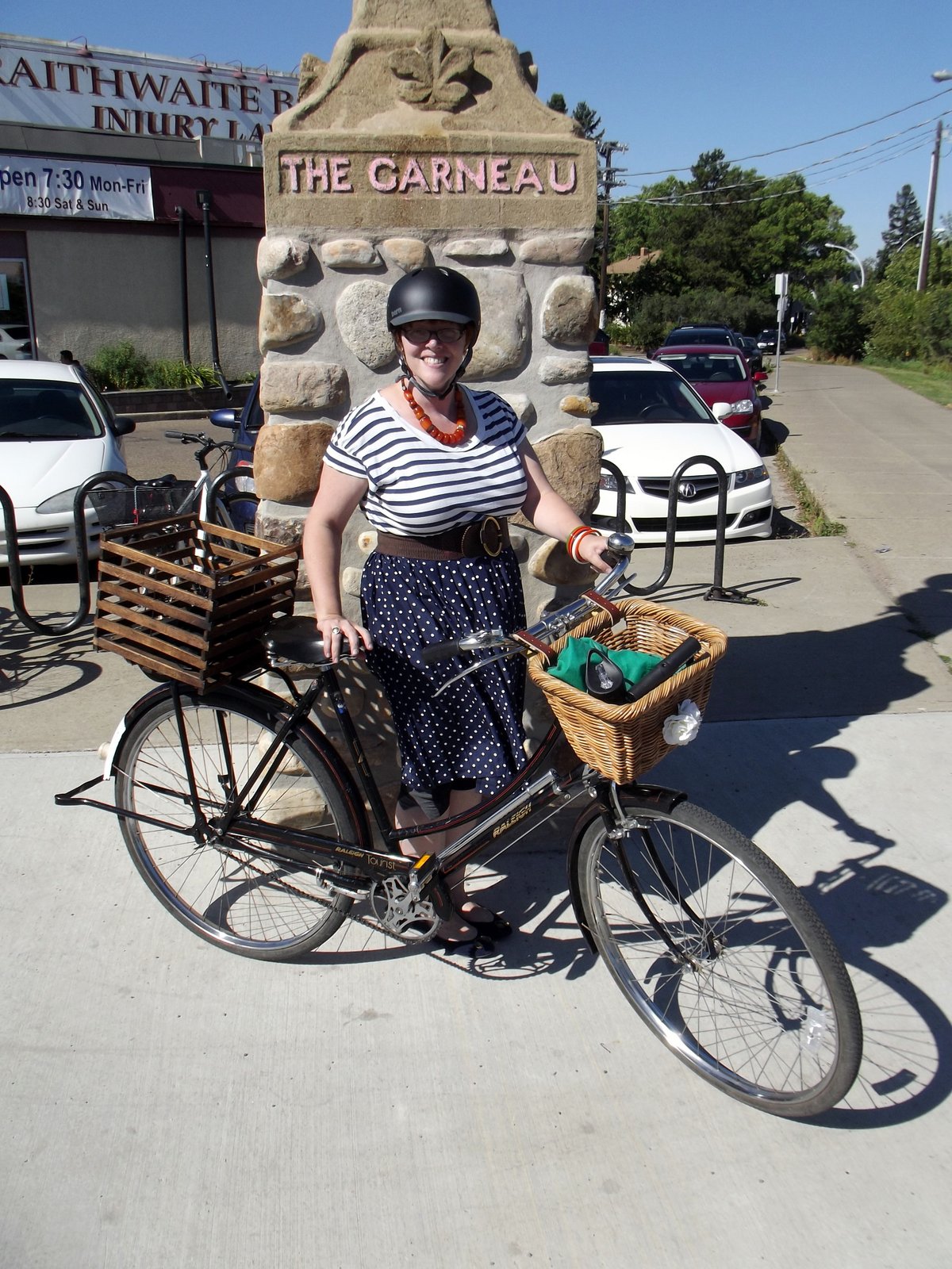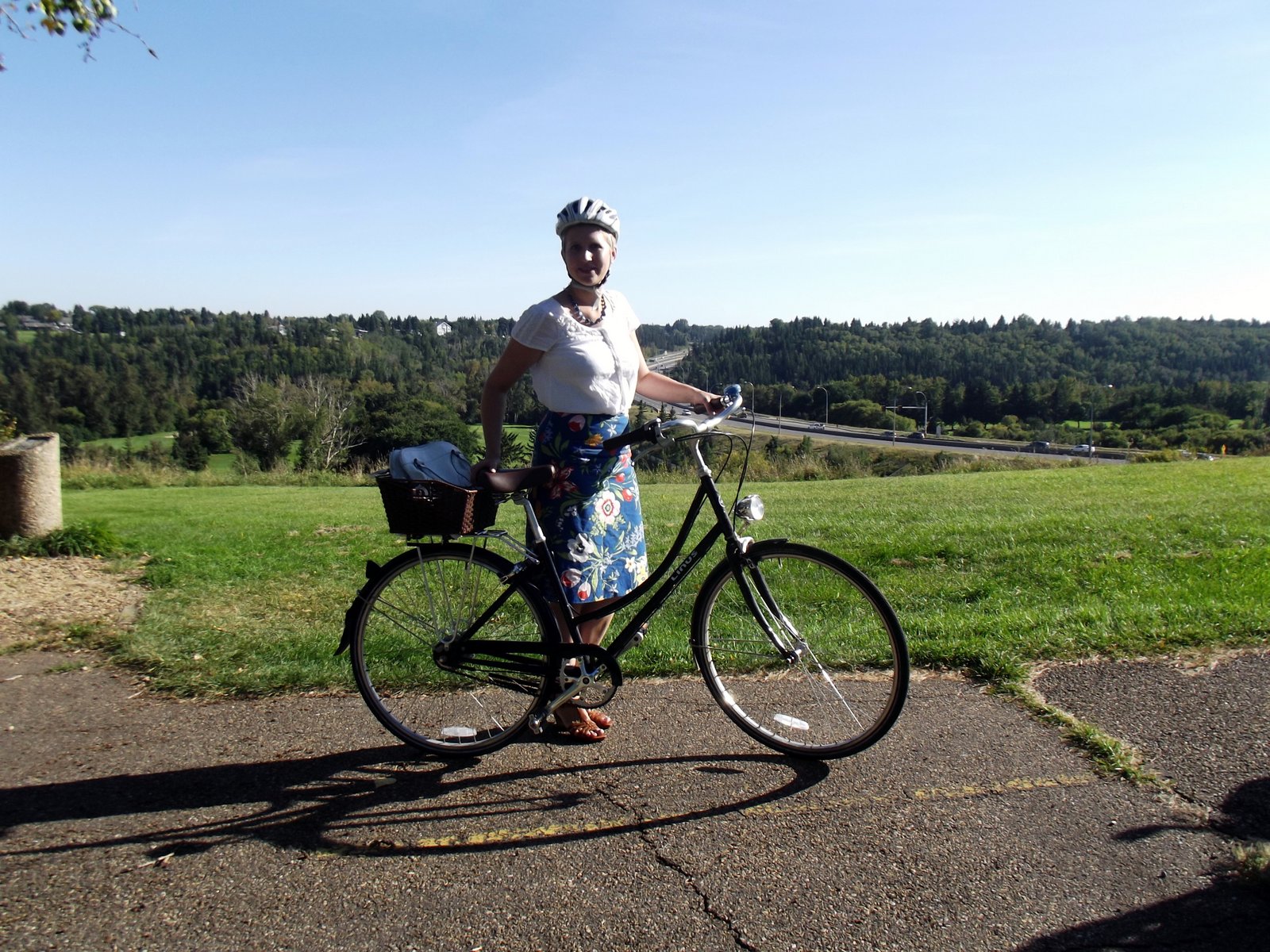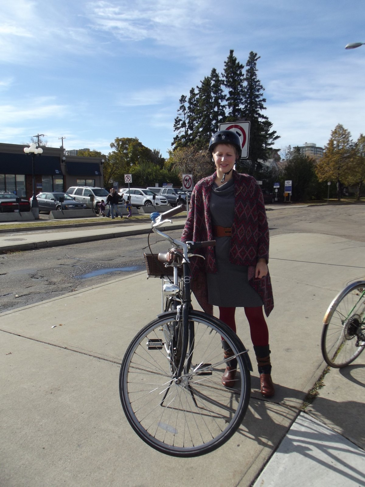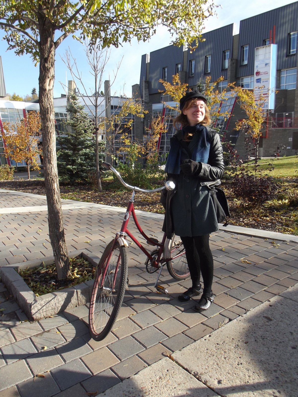 | To our delight, Coreen caught up to us riding her 'new old CCM'. It actually took me a sec to process that she wasn't on Poplar. The '46 CCM is truly beautiful in person. Go read its story at the link. We went exploring inside the Cite building briefly, then hopped back in the saddle and headed back toward the U of A via a steep shortcut through Mill Creek Ravine and the multiuse trail along Saskatchewan Drive, after which we parted ways. |
