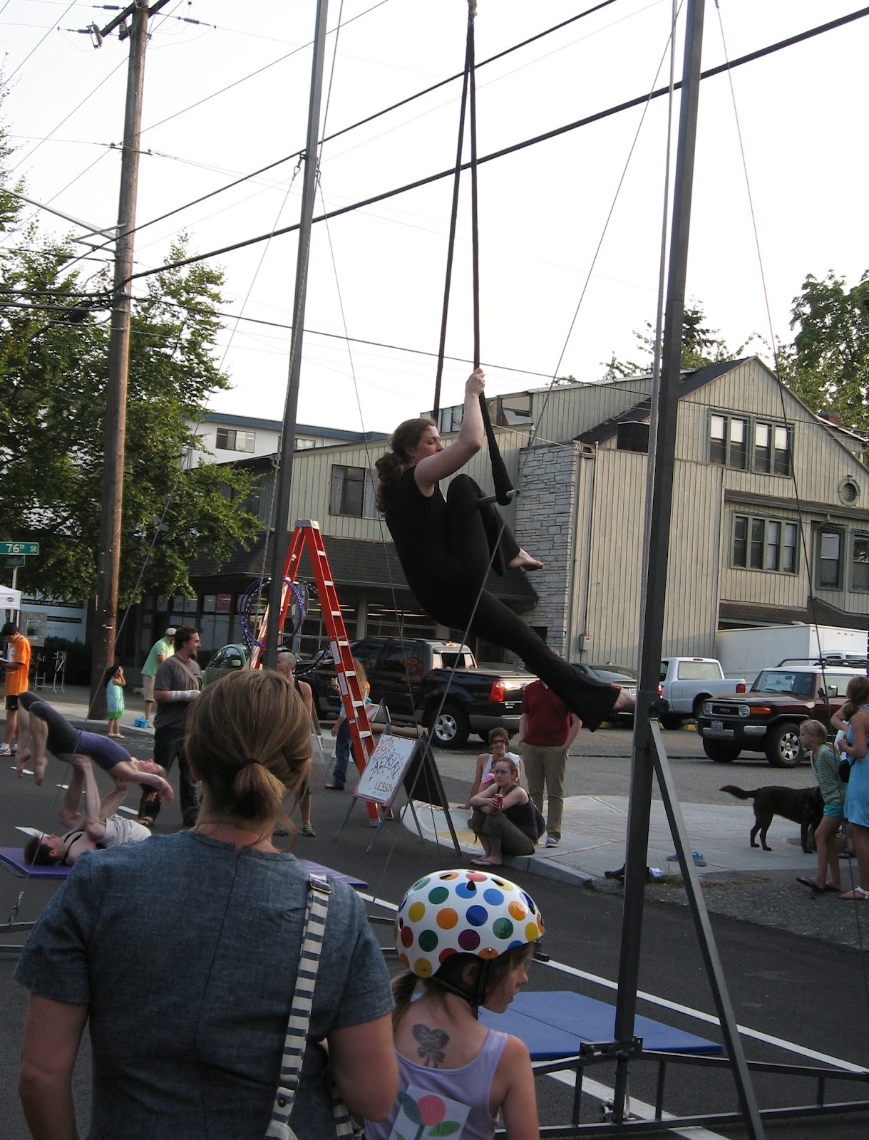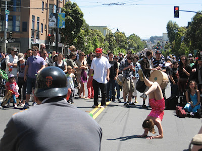 The streets were full, but not quite as crowded as at the San Francisco Fair. We ran into a number of friends with whom we had to stop and chat. There was bike decorating, a (very) brief kids' parade, and some fun performances, including a high rise trapeze act.