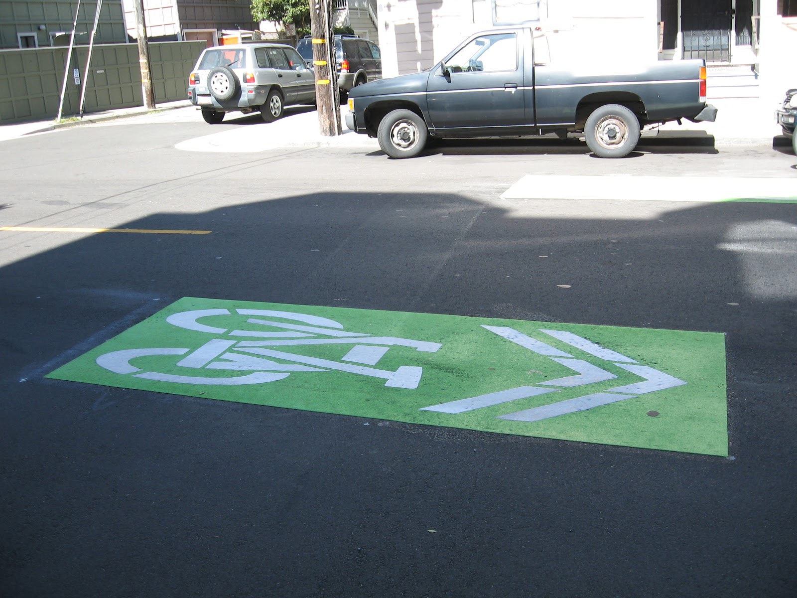 Our route home went along "The Wiggle", which wins for the best named bike route EVAH. The city has recently replaced the original sharrows with the green version above. They're bright and I love them. There is no way you could miss a turn marked with these babies.