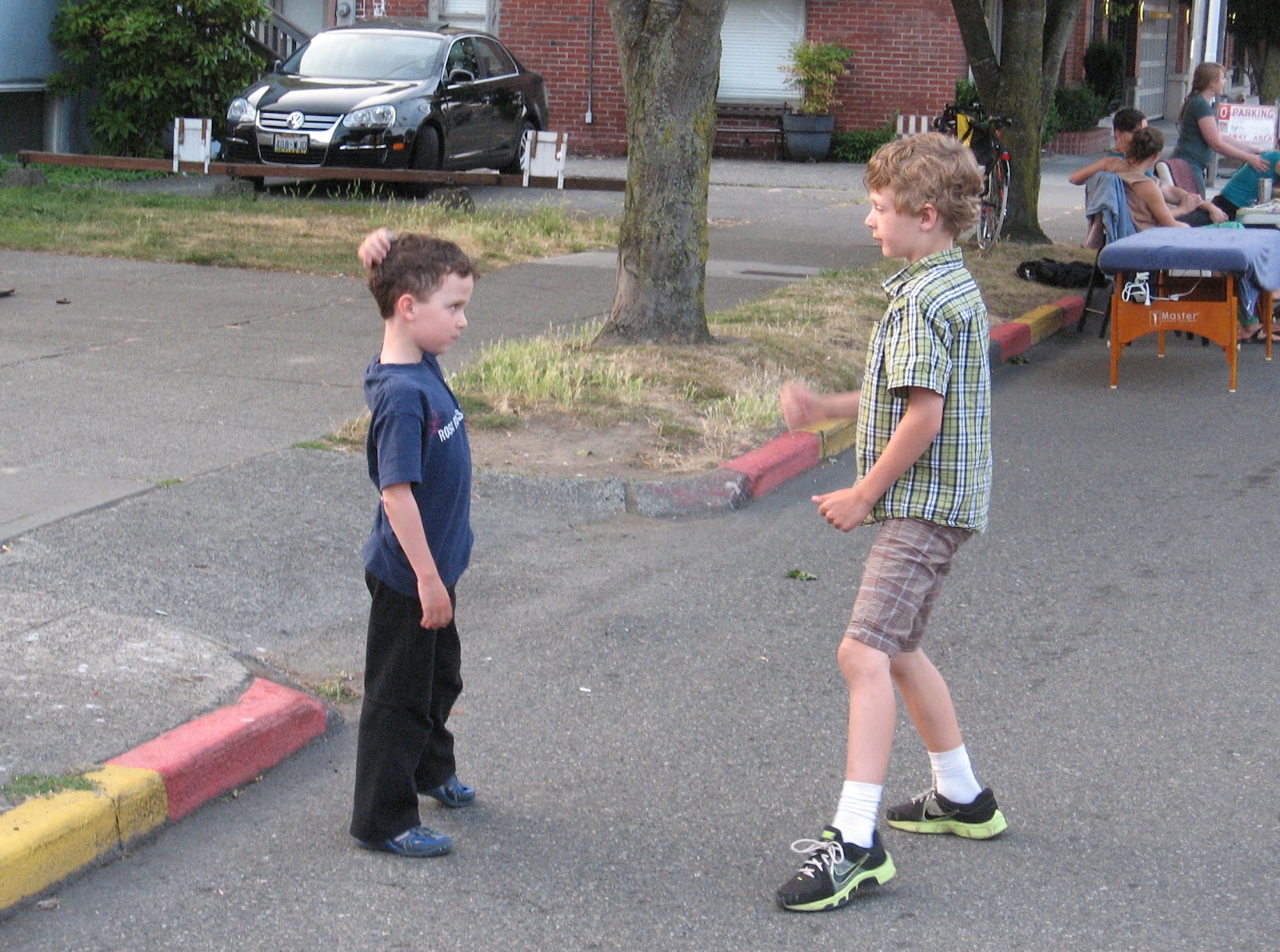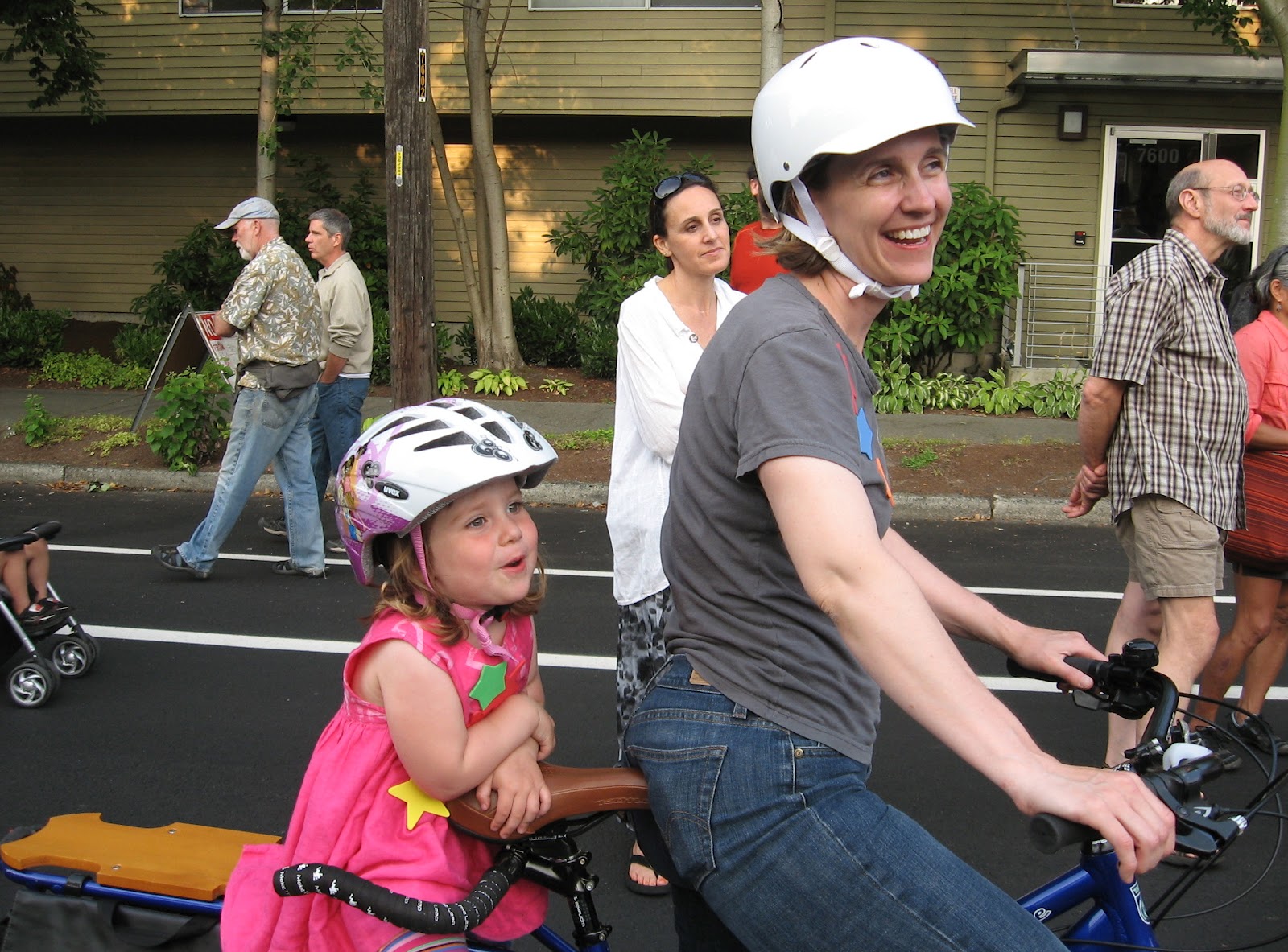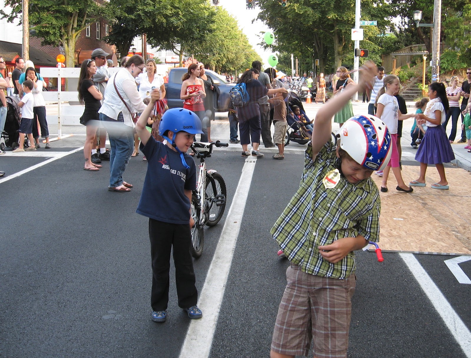 Last month, Seattle's Greenwood neighborhood had their street fair. By a terrific coincidence, Hum of the City was here for a visit, staying with Family Ride! The family biking blogosphere can be such a small world some times. This time we were there at the very start of the street fair, which was a strangely gradual affair. "Oh look, they've closed off the street! Let's go, kids! Whoops, there are still cars coming, get back to the side!" Fortunately, it wasn't too long before the streets were really, truly closed to cars and the party began.