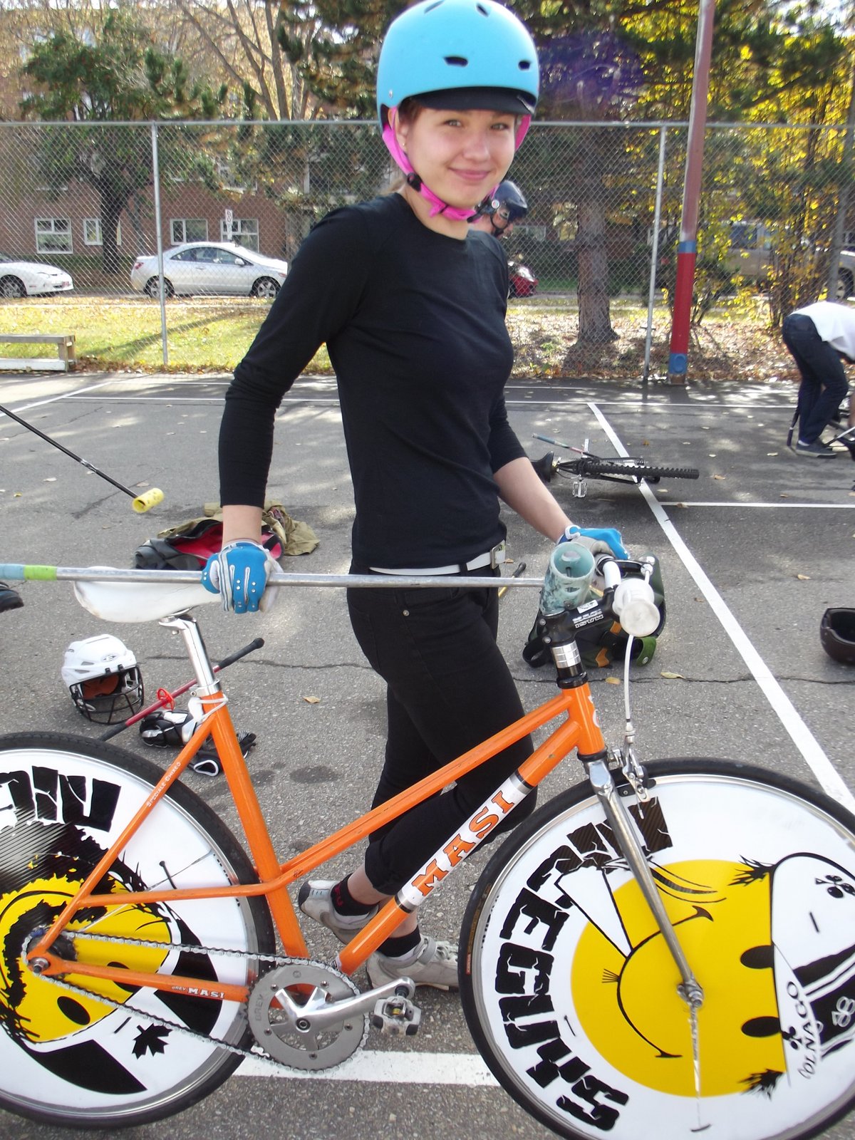 | This is A. from Calgary's NiceGuys. Check out her gorgeous Masi mixte and the team's wicked spoke protectors. |